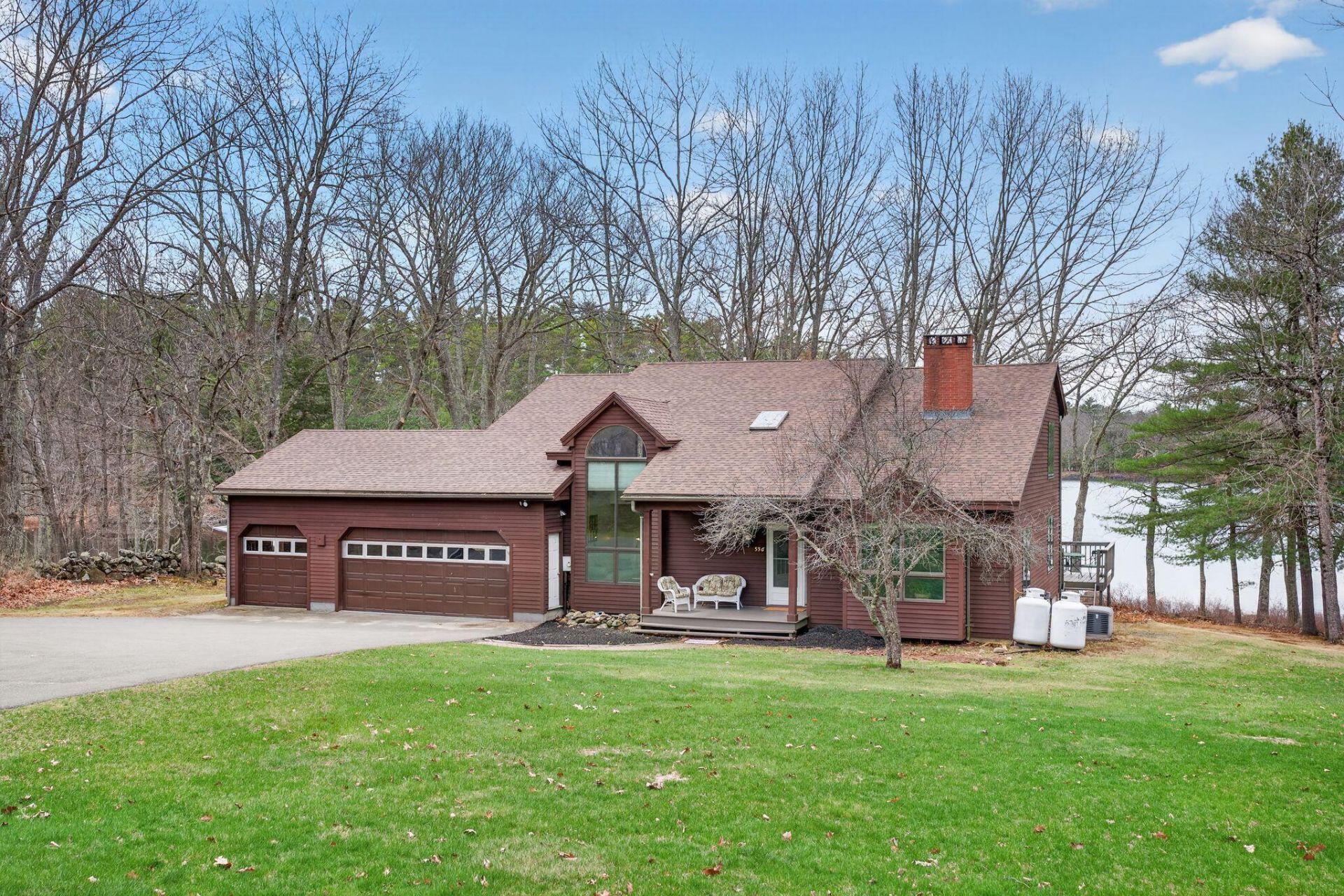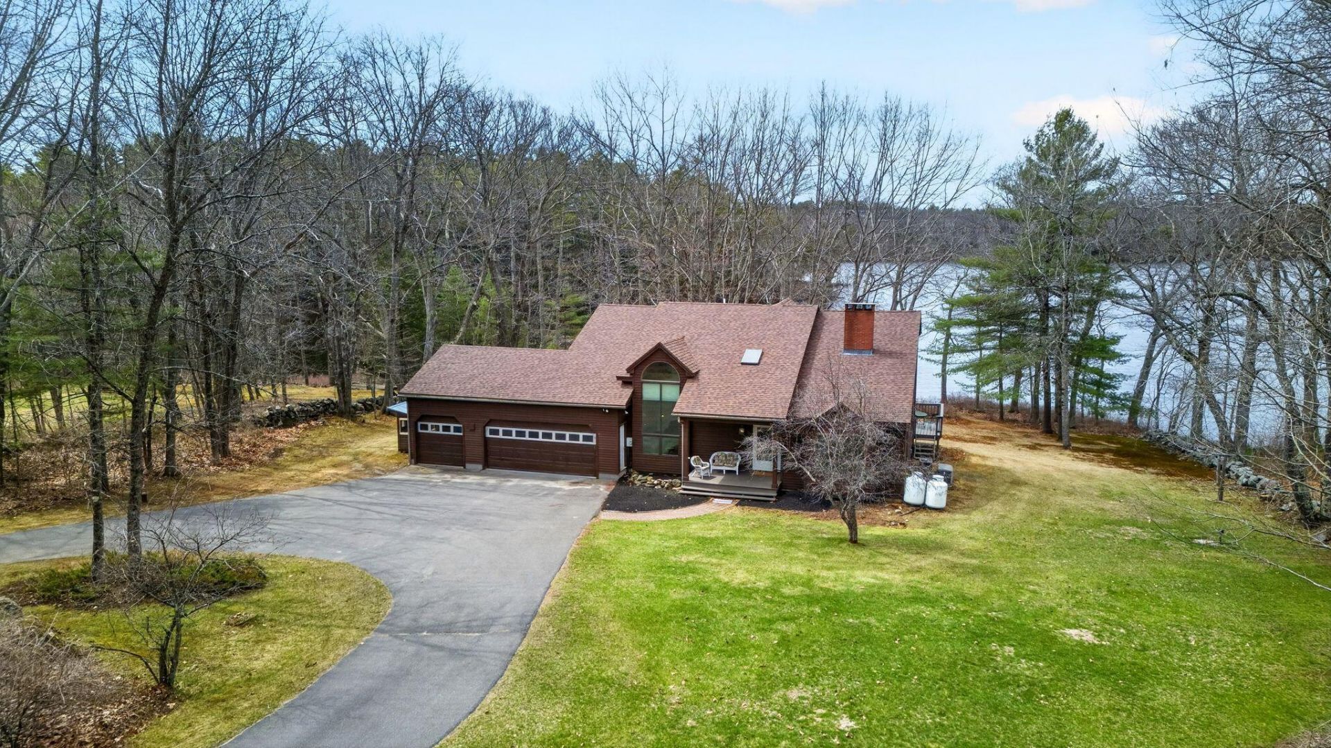 Welcome to the Wayne Village where this beautiful Contemporary is set back for privacy on 2.27acres, and enjoys frontage on Androscoggin Lake. Pick a spot on the deck to enjoy sunsets. It's 324'of waterfrontage offers a sandy & rocky shoreline. Built in 1991, this 3-bedroom 2.5 bath home catches a view of the lake from every room. Features include hardwood floors, vaulted ceilings, and beautiful cherry cabinetry built-ins in the living room and den. Cozy wood heat to take the chill off, or central air to beat the heat. A 3-bay garage has room for your boat. Plenty of space outdoors to host your company. Updates include new boiler, roof, windows and doors. Come see this beautiful home now!